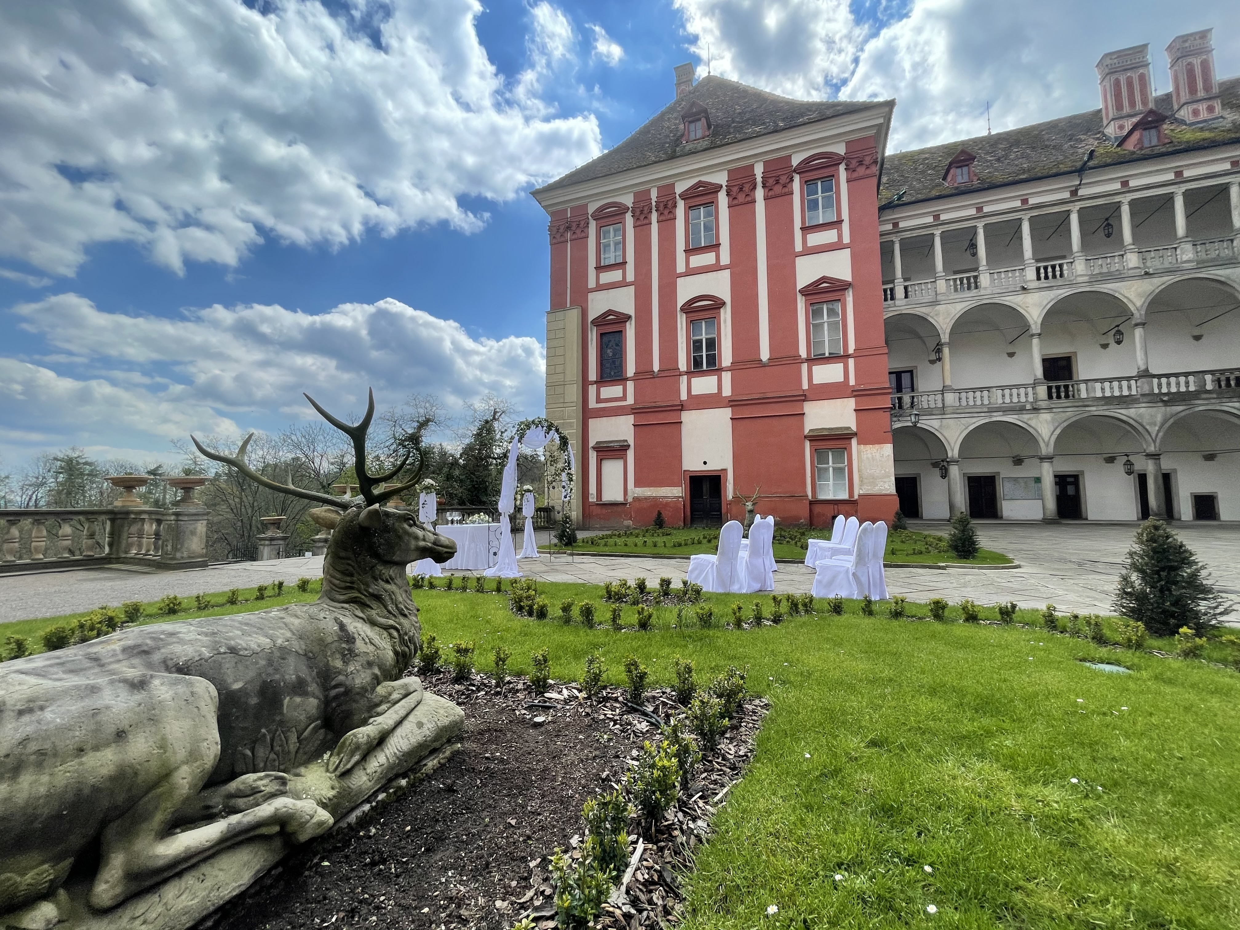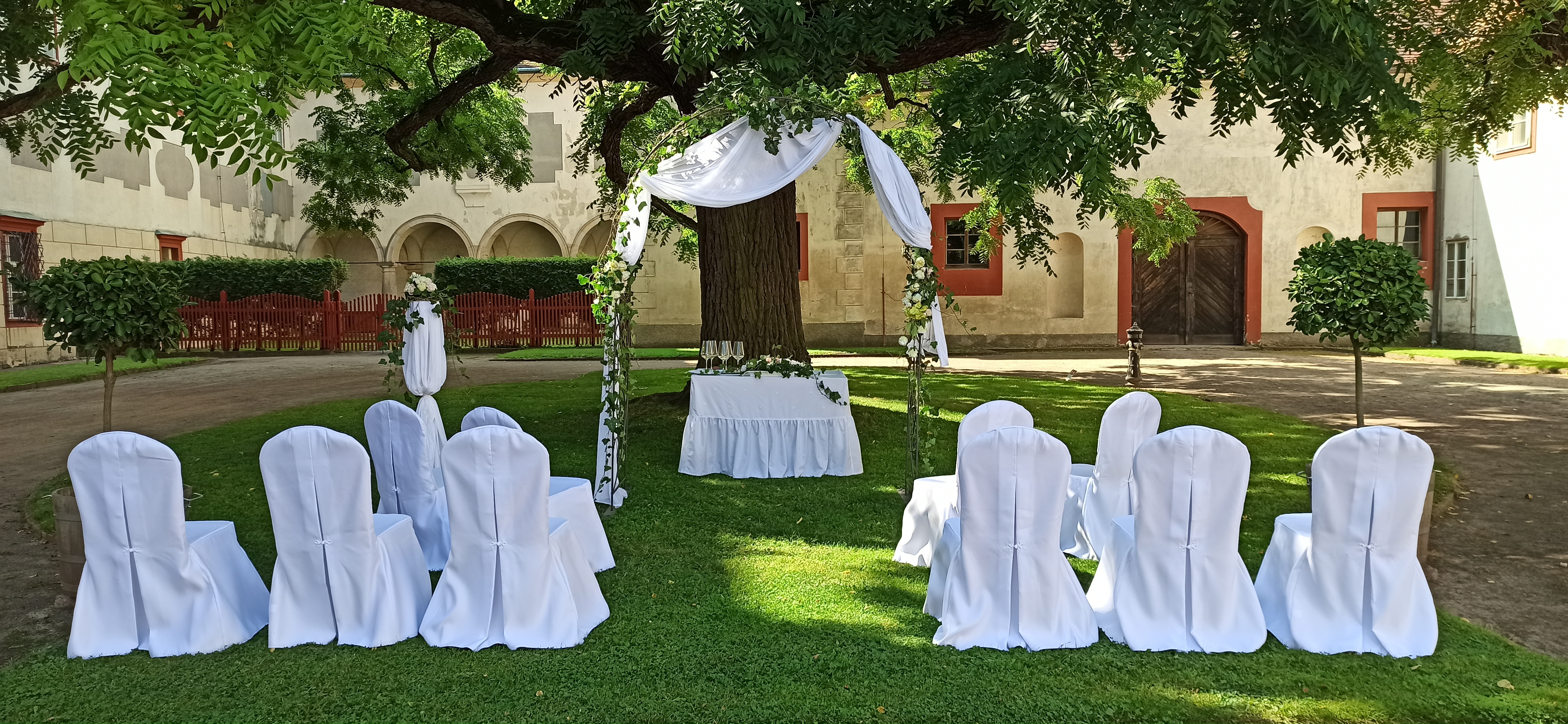 Svatební obřad se odehrává v místech I. nádvoří, pod velkou zámeckou dominantou - ořešákem černým na travnaté ploše. Při výběru II. (arkádového) nádvoří pak v prostoru směrem k vyhlídce na Orlické hory mezi travnatou plochou.